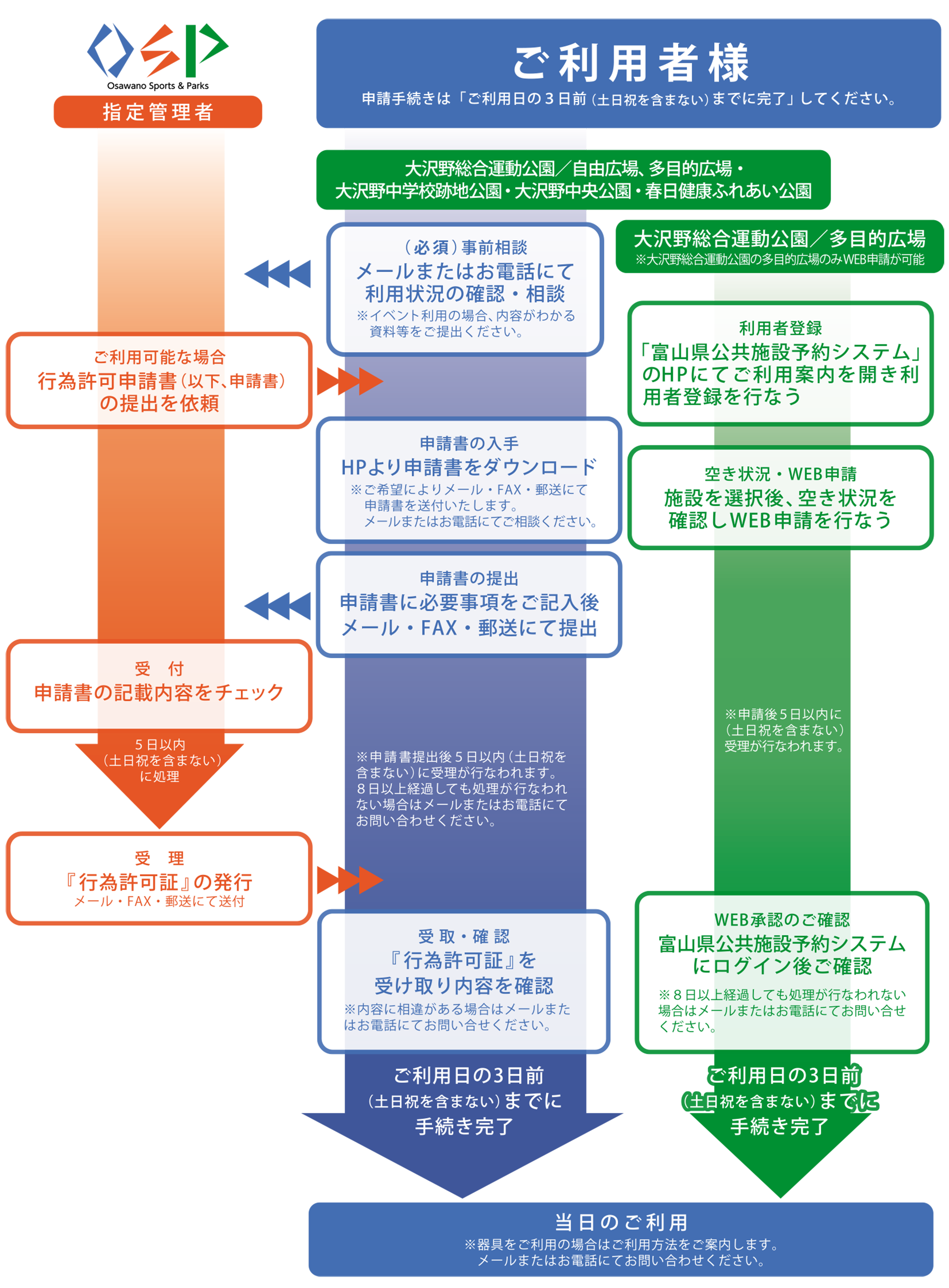 OSP(大沢野スポーツ&パークス)公園管理事務所 〒939-8253 富山市新保271番地(株式会社野上緑化内) TEL.076-429-1310 FAX.076-429-4374